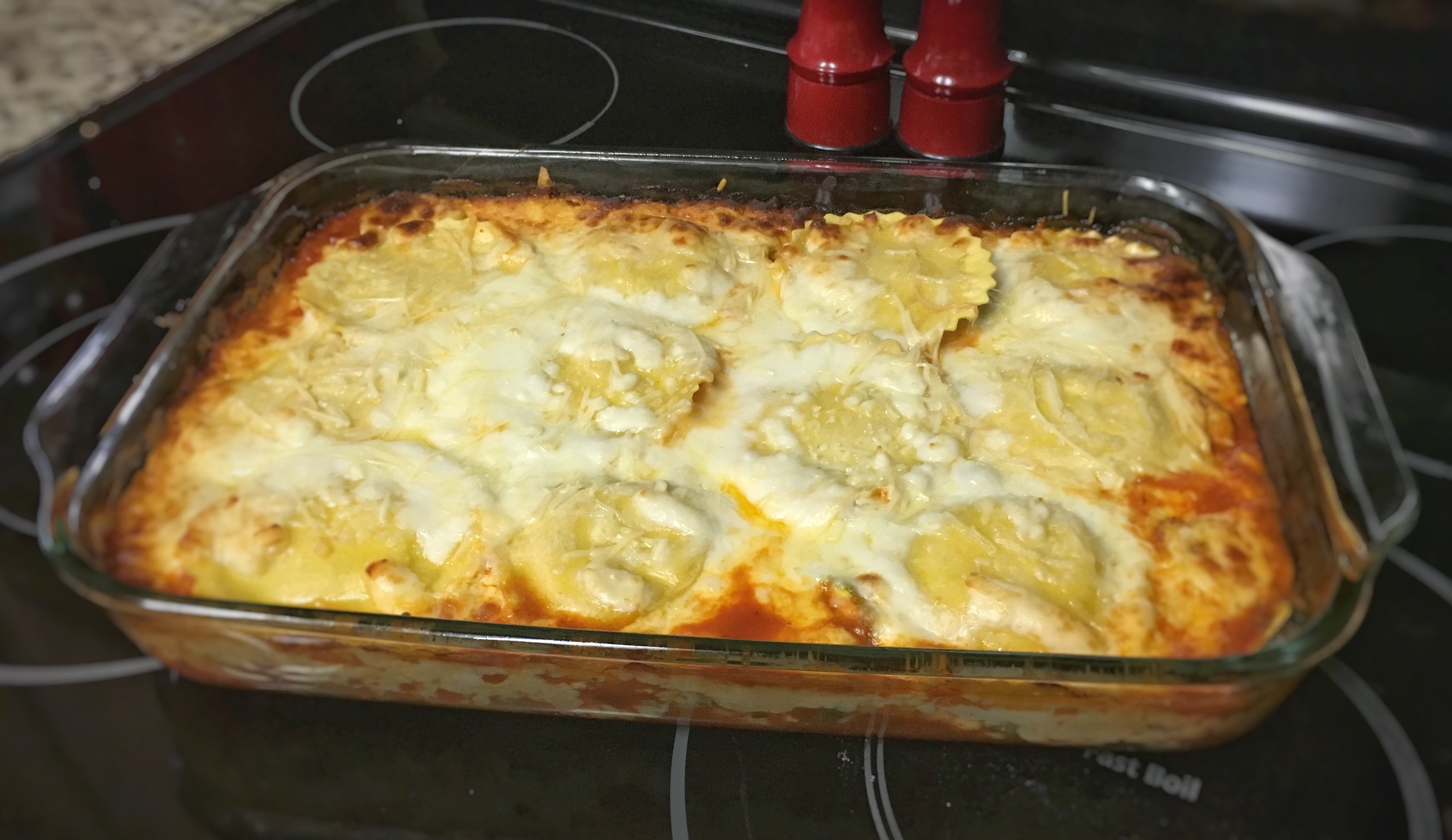 Put about half of the pasta sauce on the bottom of the pan. Lay ravioli on top of the sauce. My ravioli were round but square really work better. Cover ravioli with sliced zucchini. Top ravioli with half of cheese. Repeate except for zucchini layer- sauce, ravioli, mozzarella. Sprinkle with parmesan, if desired.