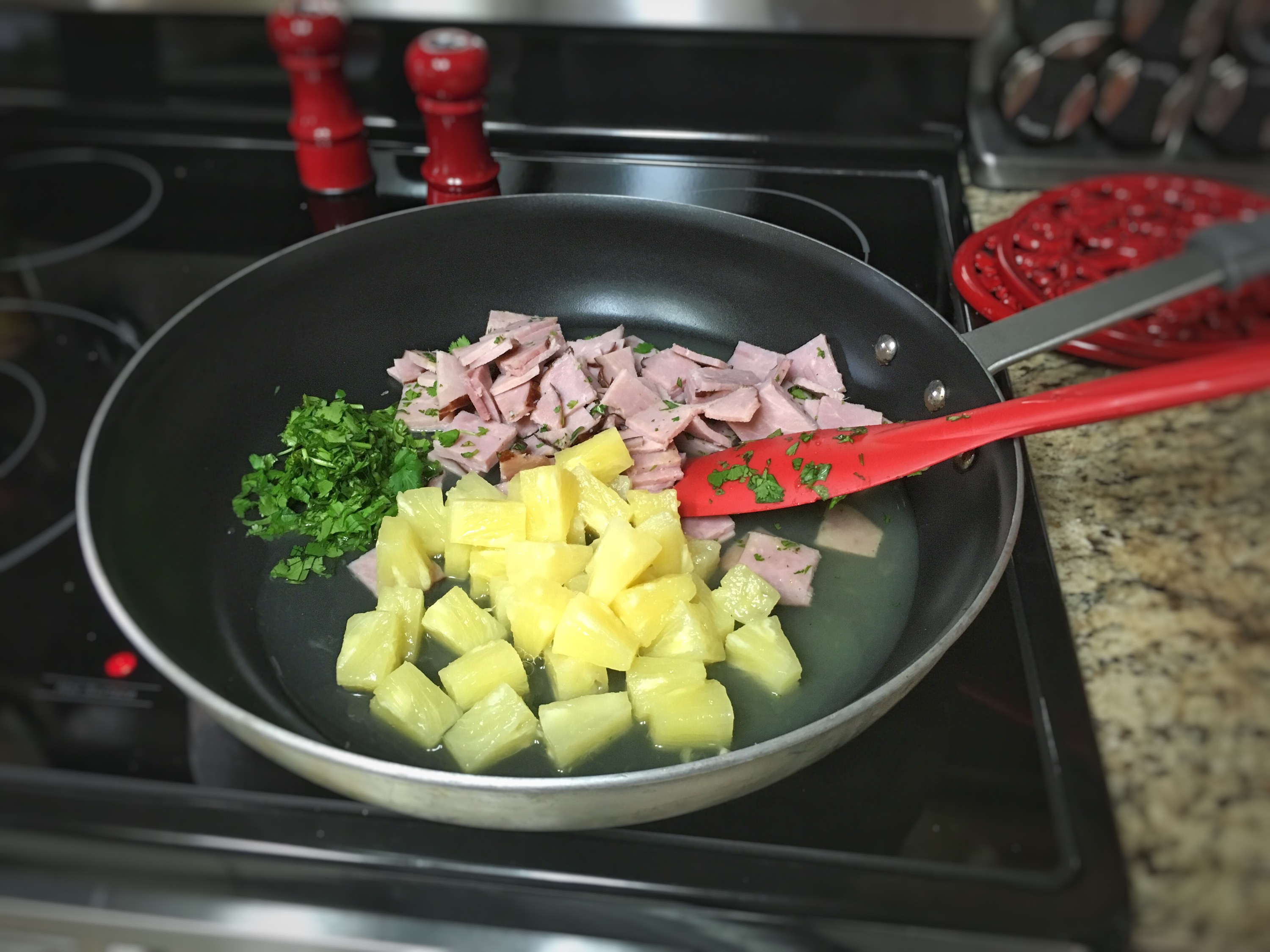 So I decided to make up my own sauté version. I call it BBQ Pineapple Ham Sauté. Very original, I know. Here it is: