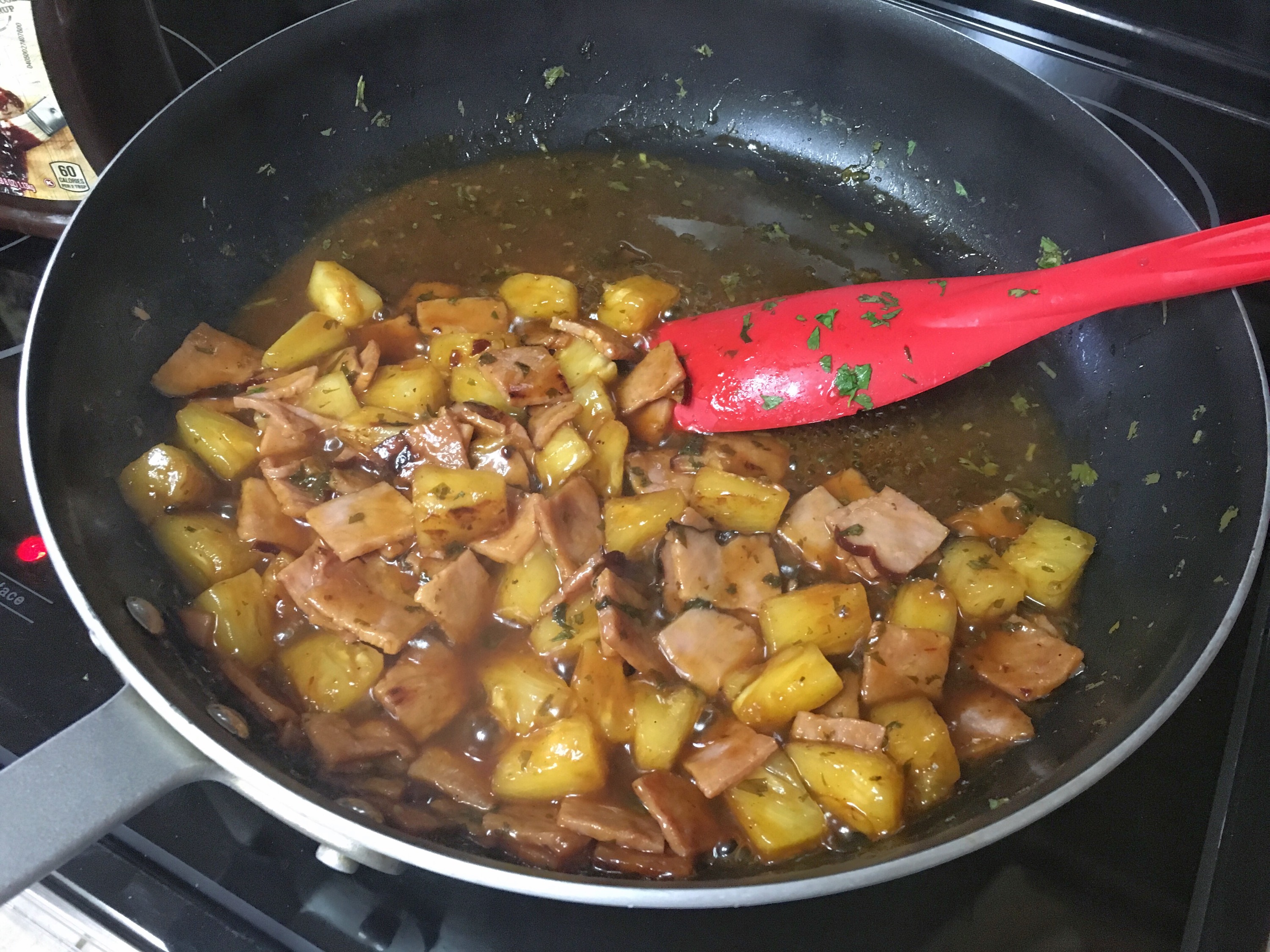 Bring to a simmer. Simmer for about 20 minutes, stirring occasionally, or until the sauce gets thick and the ham and pineapple gets some color.