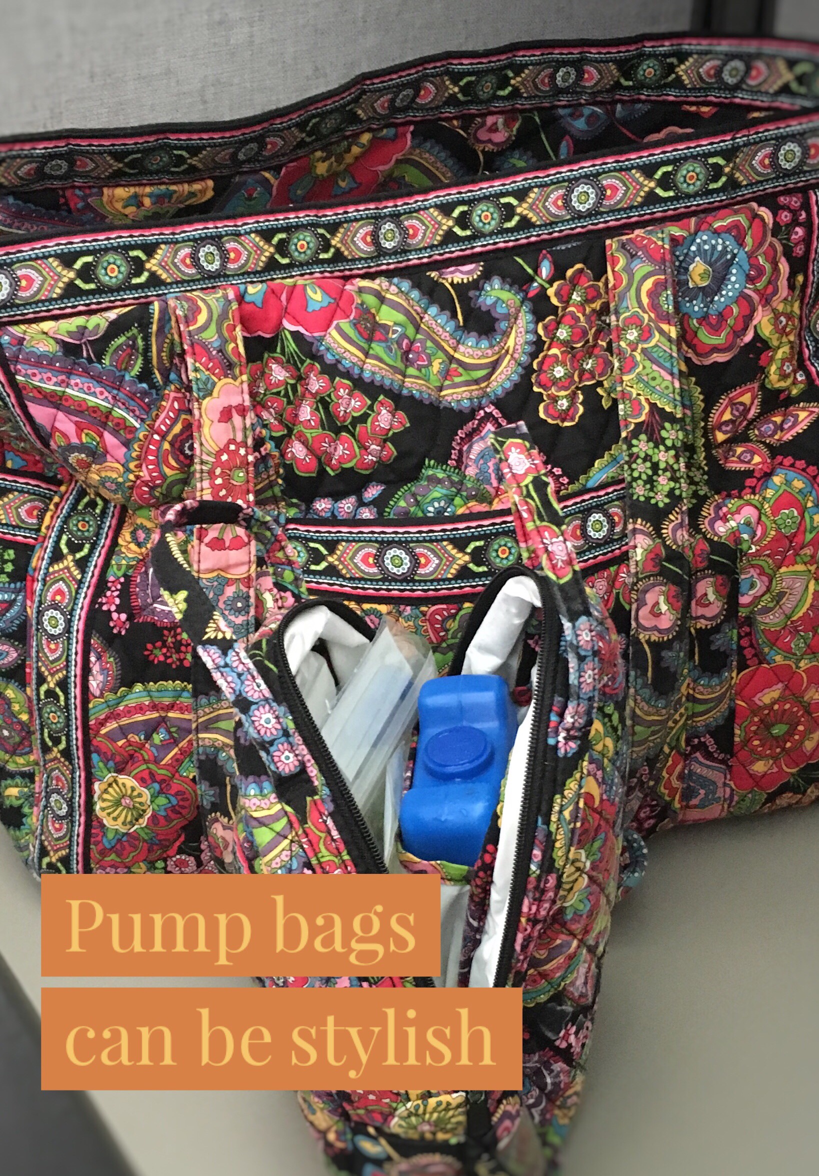 - My pump bag has everything I need in it, including my rented hospital grade pump. I use a large bag for this rather than the little pump bag that many pumps come in. I have a smaller tote that I bring bottles, breastpump accessories and cooler bag to and from work in daily (along with my lunch, snacks, and coffee). When I go to pump, I put my pump accessories, cooler bag, and laptop in my big pump bag before heading to the pumping room at work.
