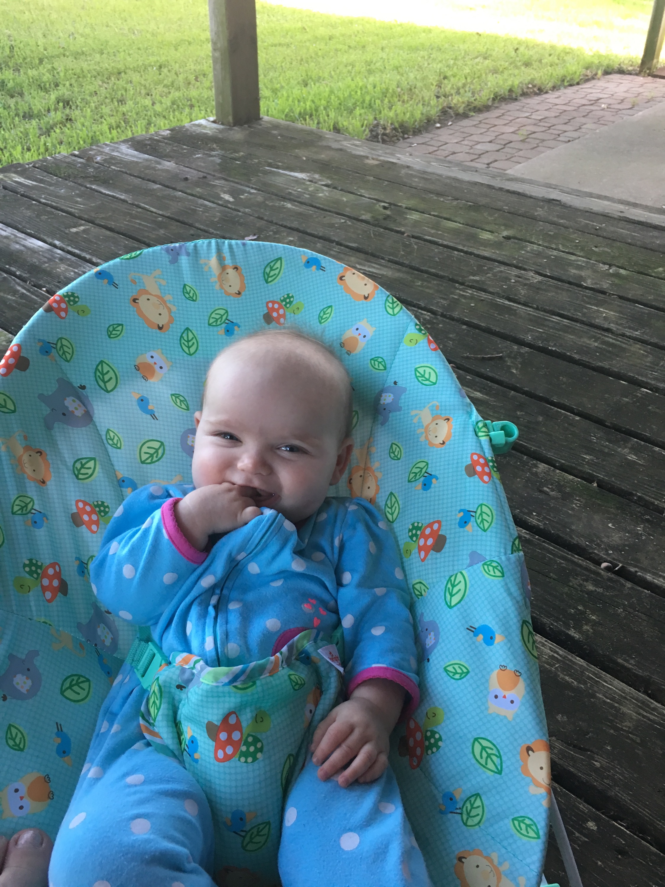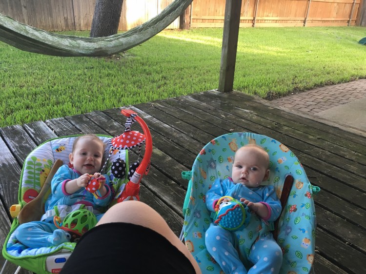 So I made some coffee, grabbed the bouncers, baby bug spray, and a few toys and we headed out to the back porch.