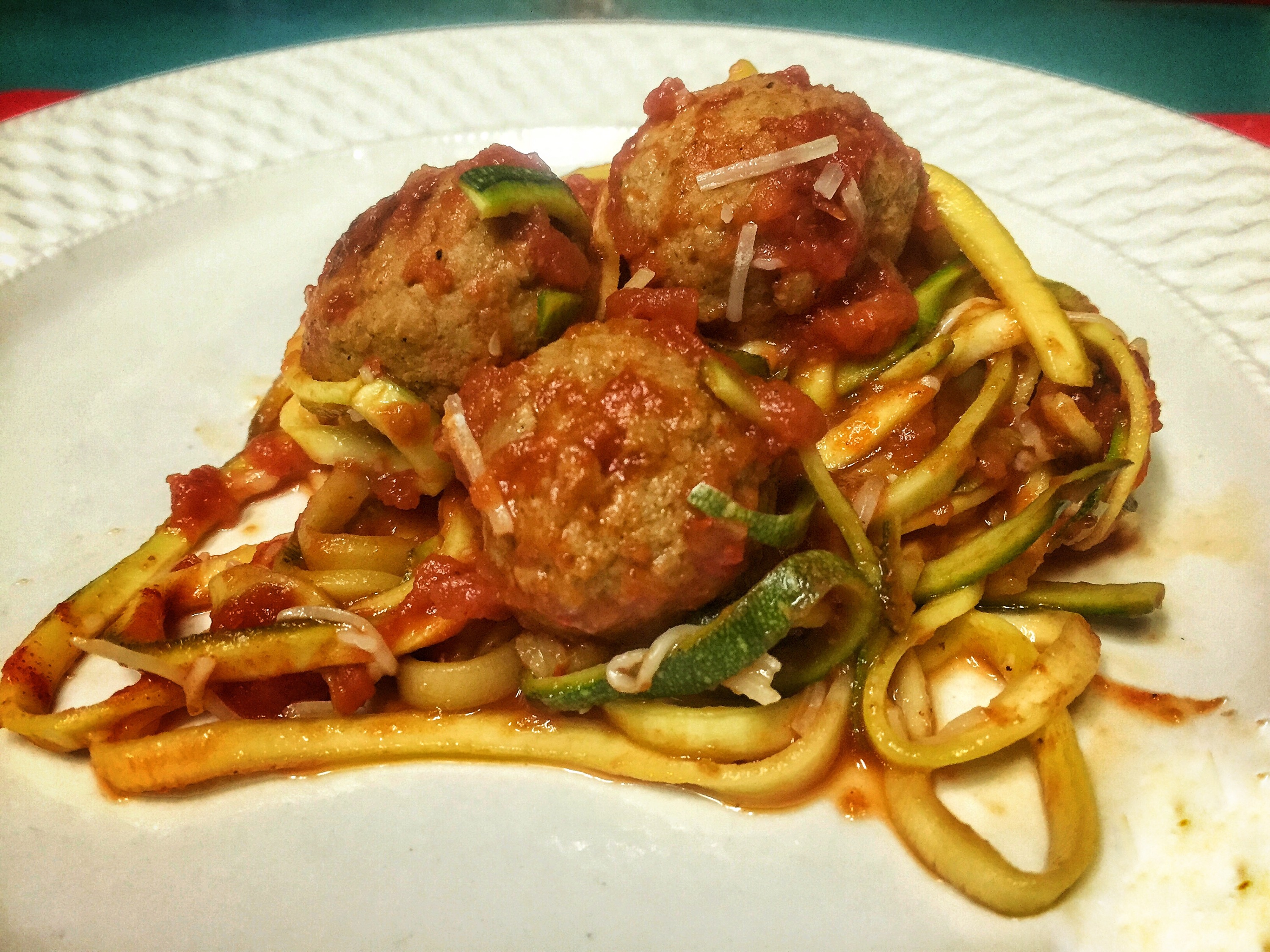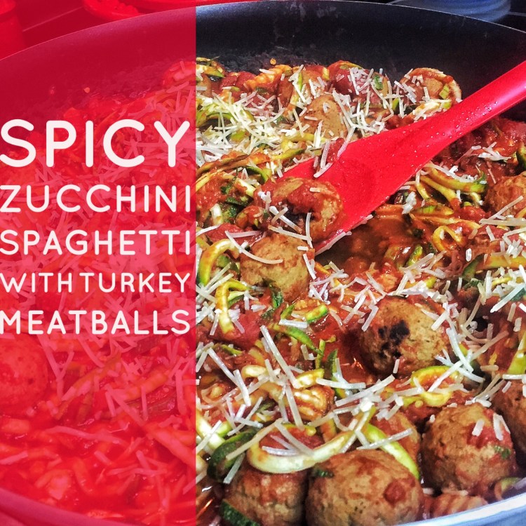 Since I had a Pei Wei salad for lunch today, I knew tonight called for light meat. I just happened to have a Sam’s Club size bag of turkey meatballs that I figured would be a perfect addition to the zucchini spaghetti.