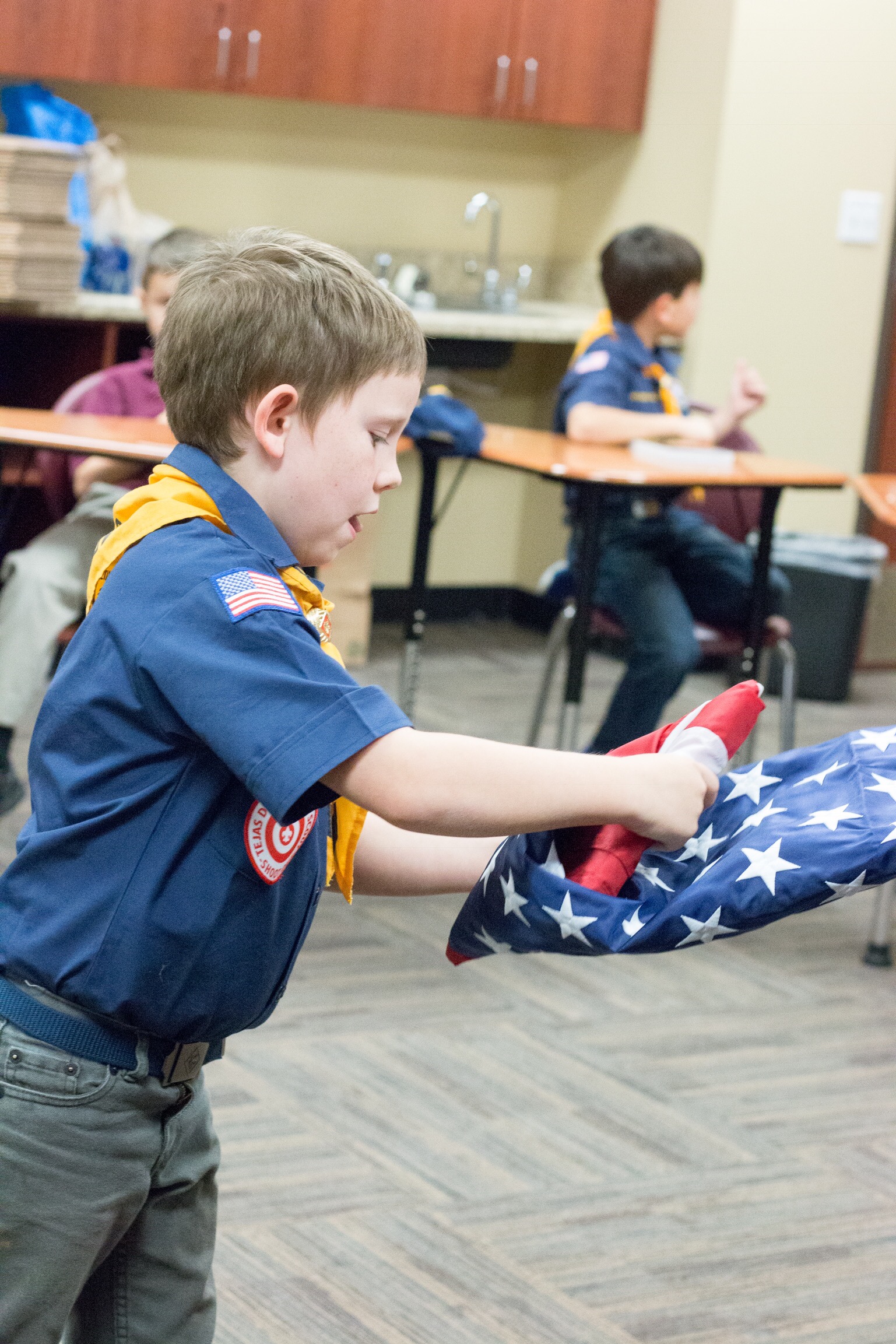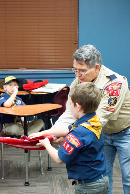 He’s in Cub Scouts. It’s crazy having that many little boys in one place but I think he’s still learning some great stuff (like how to fold and properly handle a flag).