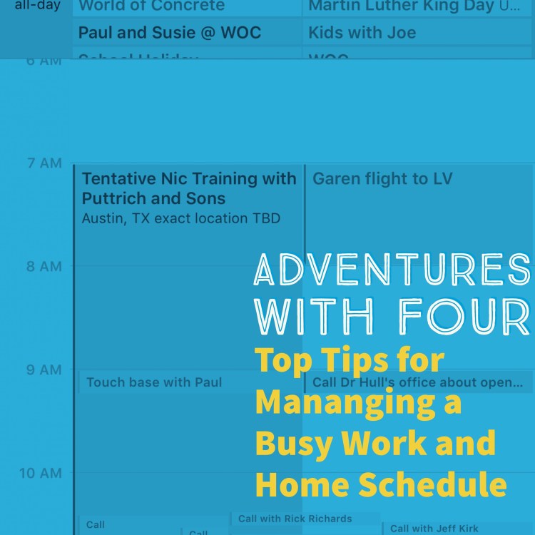 Almost once a week Garen or I have to work out of town or have a work dinner at night. With four kids, people always say “I don’t know how you do it.” Honestly, what choice do you have but to figure it out?!? With that in mind, I thought I’d share a few tips on how we survive with our busy work and family schedules.