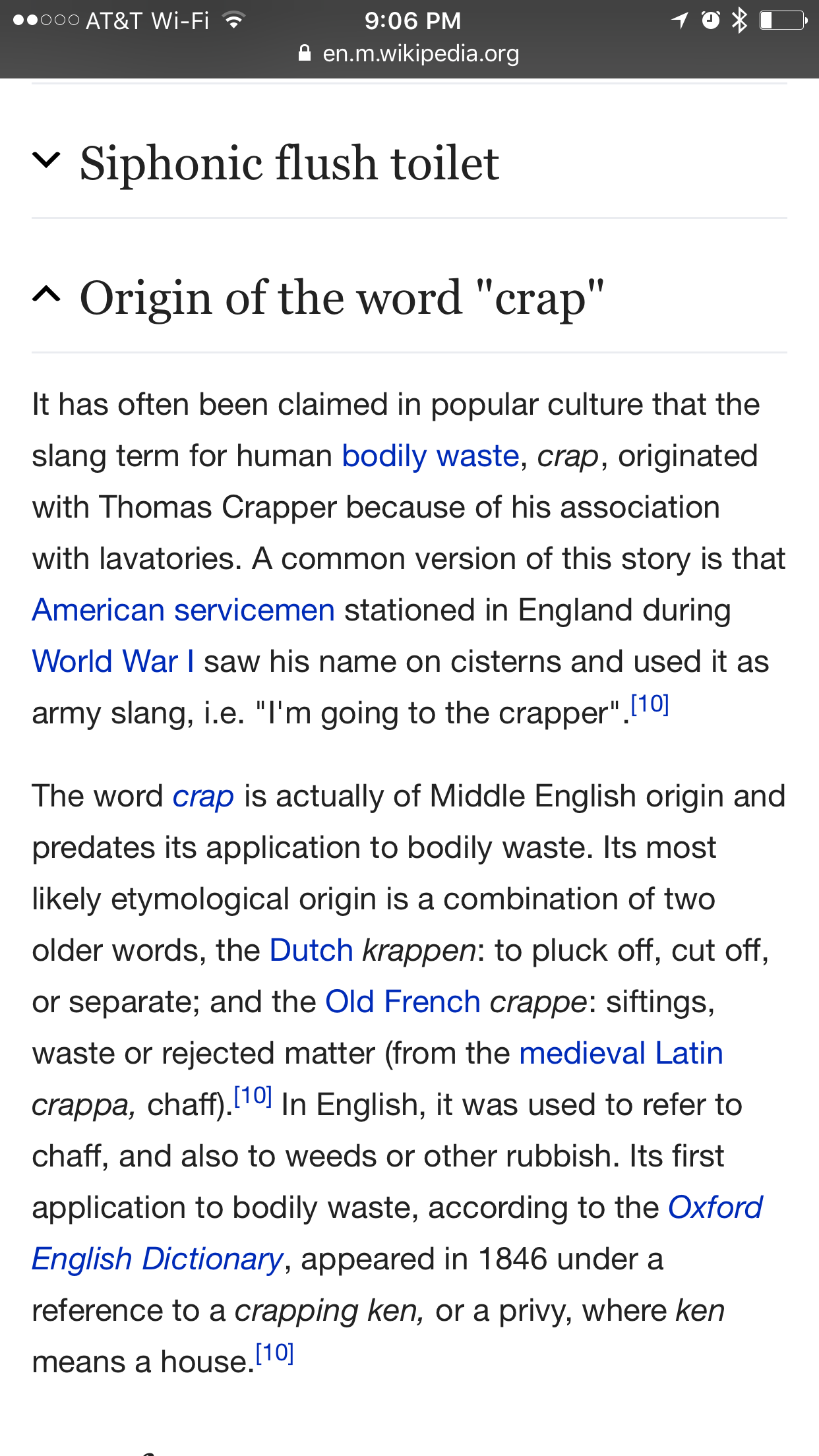 However, evidently they might’ve been wrong too. Per Wikipedia, the origin of the word “crapper” actually comes from the combination of two older words. Does this mean what I learned in one of my college courses was actually load of…