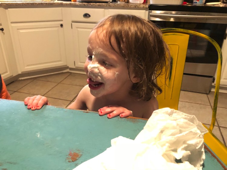 The mess was worth the fun….plus, we did this right before bathtub. Easy as pie! (Pun intended).