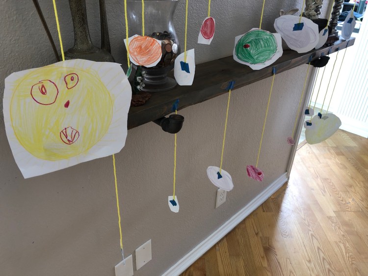 - The girls and Garen made and hung up the planets while I had morning conference calls- Yes, y’all, this man is super-dad. And he’s mine.