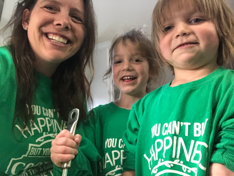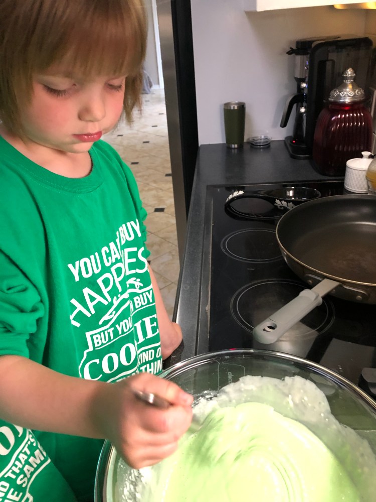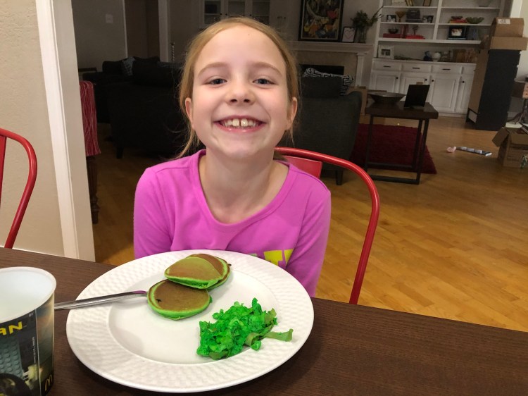 - We started the day a little different than our typical birthday breakfast (which is donuts) since we didn’t want to get out of the house. Instead, we had green eggs & ham, with green pancakes too though and everyone was happy. Kate got to help with the pancakes and Clara got to help with the green. And, man were they GREEN….as were our Girl Scout Cookie shirts we wore for the occasion!