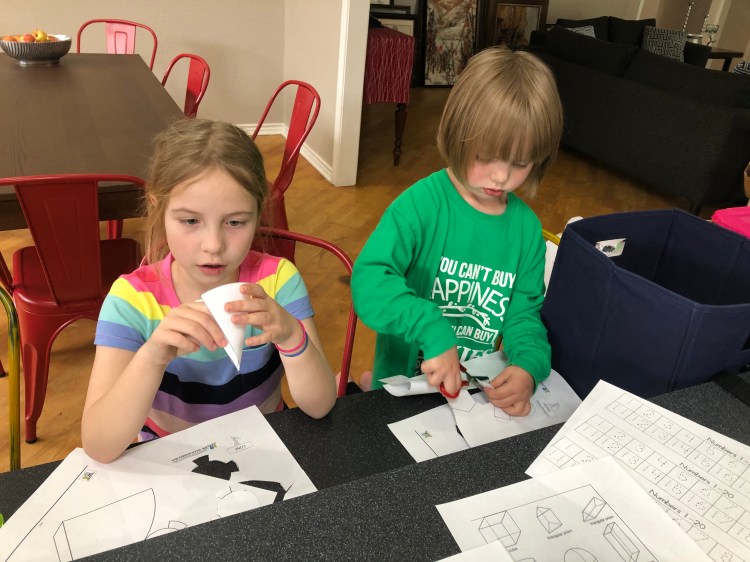 - 3-D Shapes- downloaded some print-outs from this website: https://www.math-salamanders.com/3d-geometric-shapes.html and we only got one and a half done but the point was there.